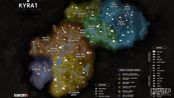 想要知道《孤岛惊魂4》中的开放世界有多大吗?虽然育碧的这款射击冒险大作还没发布,但完整版的地图已经悄悄现身了,这张地图展示了Kyrat地区的各种 地貌和生态。图中我们可以发现,游戏的地图大致被分成6块区域,包括了喜马拉雅山区, 高山区 (Coniferous和Larch), 中部地区(Forest和Quercus)和台拉河地区。