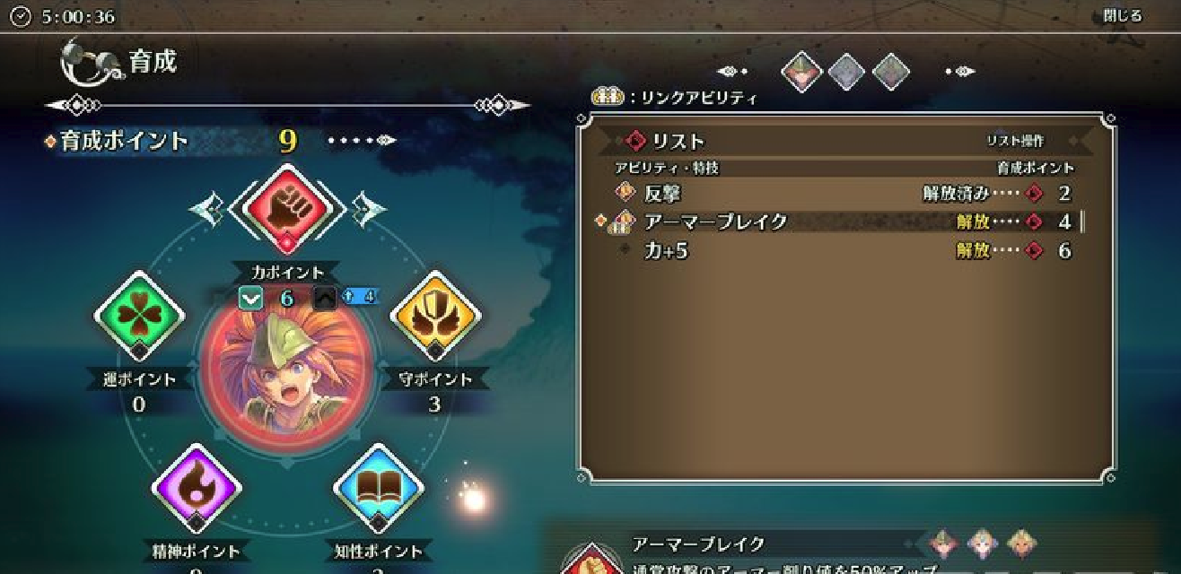 角色们随着等级提升,HP、力量等基本属性都会增长。同时升级时还会获得“培养点数”,可以用于获得特技、技能或是提升各种能力,而已经分配过的培养点数可以在某个地方进行重置。