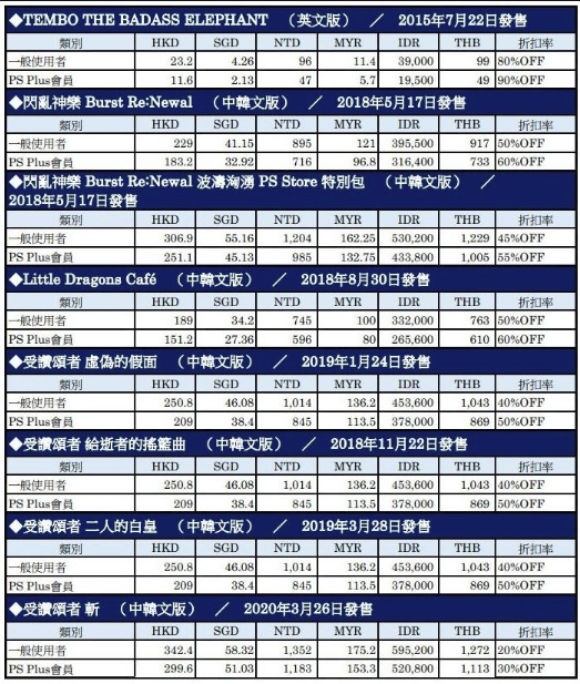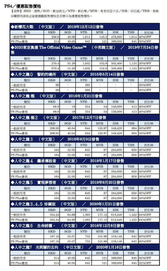 具体港服PS4 SEGA游戏折扣列表见下图: