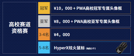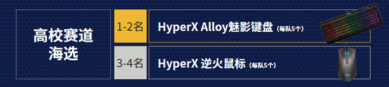 高校海选赛于11月24号开启报名,12月11日至12月12日进行比赛。比赛为线上赛,512支队伍报满即止。所有队伍随机分为2组进行BO1单败淘汰赛,各组冠军战队晋级高校资格赛,同时获得HyperX Alloy魅影键盘5个;各组亚军战队获得HyperX 逆火鼠标5个。