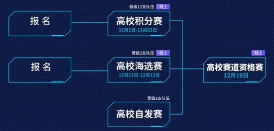 高校战队成员通过共同赢得天梯比赛、周末联赛即可获得战队积分。截止至11月21日23:59:59,高校战队积分排行榜前12的战队可晋级高校赛道资格赛。获得资格赛名额的战队将无法报名高校海选赛。
