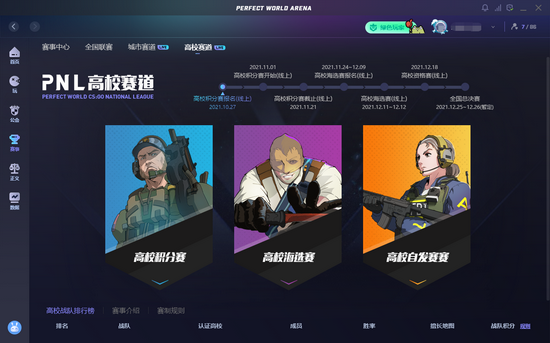 登录完美世界竞技平台并成立战队,当战队成员满足以上条件时,可点击战队页面“高校战队认证“ ,认证成功即可报名参与PNL高校赛道。玩家可自由选择参与高校积分赛或高校海选赛。