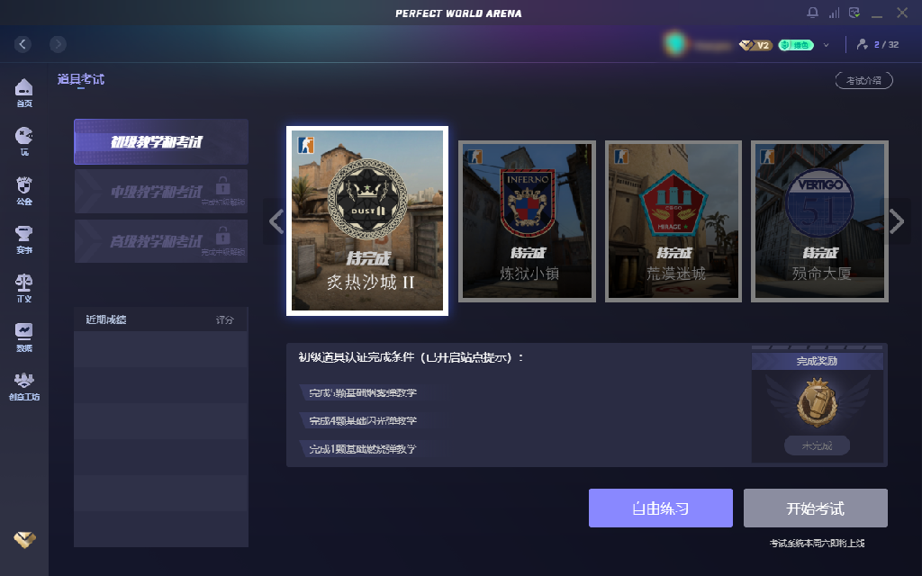 不只有娱乐休闲玩法,针对想要提升水平的玩家,平台特别开发了“道具课堂”模块,投掷物沉浸式训练,从教学到考试一站达成,分等级给予成绩评分,让你针对薄弱环节迅速提升!目前可在平台内体验自由练习,11月27日将上线考试系统,完成考试即可领取专属徽章!