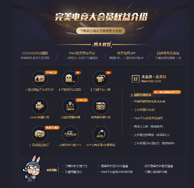 配合此次平台版本更新,完美电竞首次推出大会员服务,为有需要的玩家提供更多可选增值功能和升级体验。“完美电竞大会员”联动完美电竞全线产品,包含完美世界竞技平台、完美世界电竞APP、CSGO国服、DOTA2国服和蒸汽平台,囊括五大模块20余项实用权益,同时满载超值福利,给予专属身份荣耀。连续包月仅需19元/月!