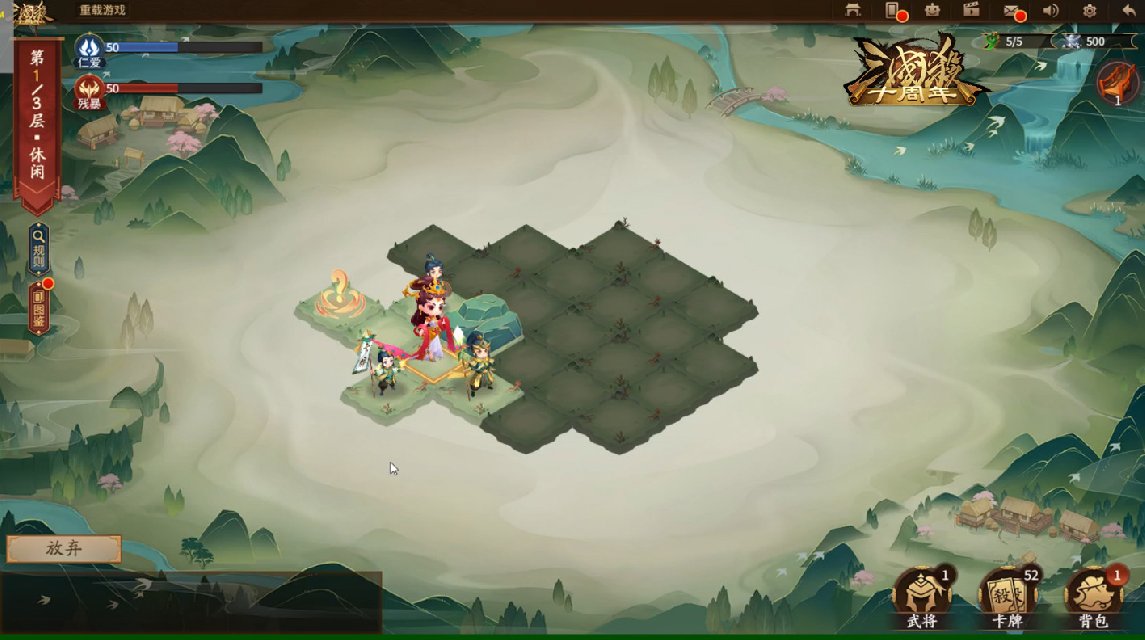 游戏中的场景是一张随机生成的方格地图,大家可以控制将灵在地图中移动探索,触发各个方格的互动:比如各种敌人、NPC角色和事件等。通过在探索过程中不断壮大自己的武将队伍,收集各类卡牌和道具,并挑战最终BOSS。