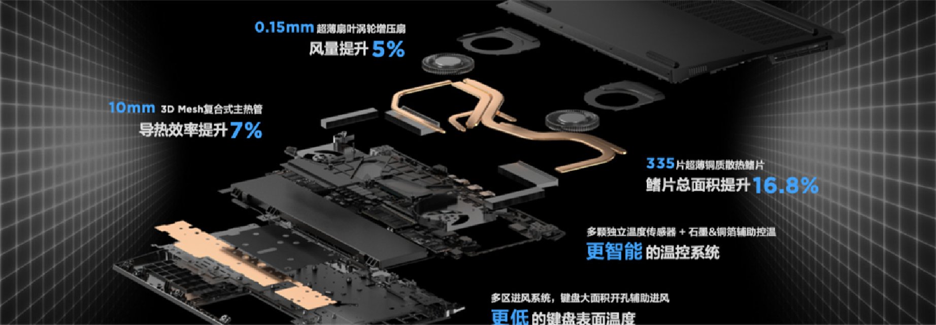 在散热上,拯救者也不满足微弱的提升。得益于拯救者深耕多年的霜刃散热系统,本次新品在机身厚度大幅优化的基础上,还拥有更强的散热释放:0.15mm超薄扇叶涡轮增压风扇,提升风量和转速,配合超薄铜质散热鳍片,增加了散热总面积,让热量无处停留。多颗独立温度传感器精确感应热源,打造更加智能的温控系统。