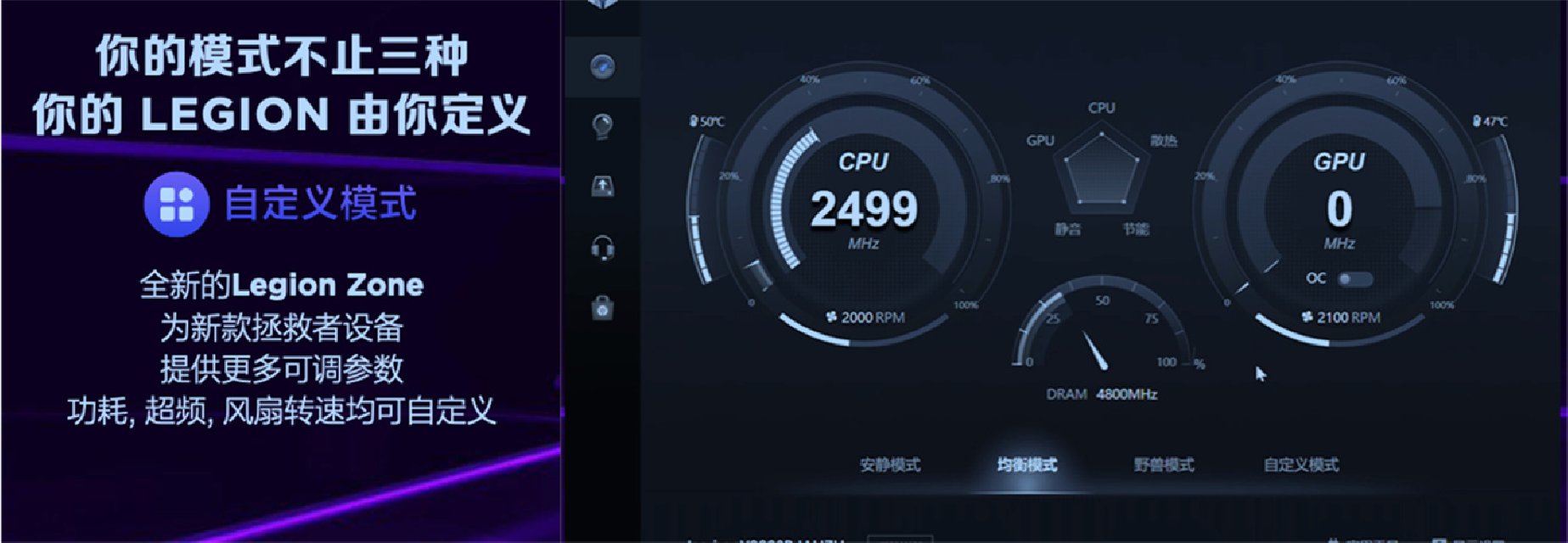 玩家千呼万唤的设备自定义软件——Legion Zone也全面应用于本次新品中。全新的Legion Zone为新款拯救者设备提供更多可调参数,功耗,超频,风扇转速均可自定义,让拯救者真正成为每一名玩家的称手武器。