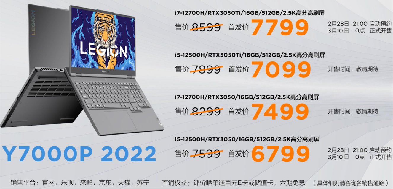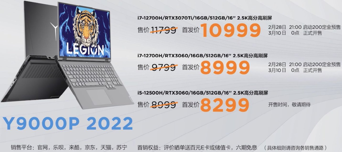 本次拯救者新品将在线上和线下全渠道销售,拯救者Y9000P 2022首发价8299元起,拯救者Y7000P 2022首发价6799元起,2月28日21点准时开启线上预售。