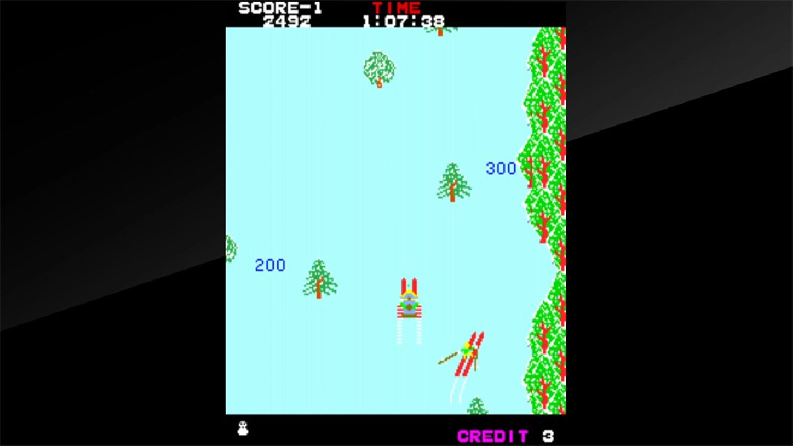 这是一款可以进行由雪道、曲道、跳台滑雪路线所组成的滑雪比赛的体育游戏。要避开障碍物和其他滑雪选手,在3个关卡中滑行。在跳跃场面中,只要配合时机跳跃,就能获得奖励得分。(1982年作品)
