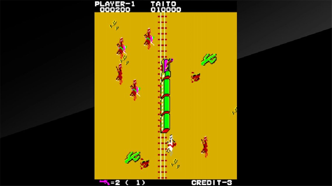 这是一款成为骑马的警长,与从四面八方偷袭来的恶徒进行战斗的动作游戏。可以在自己的马匹和列车之间来回穿梭,进行击败列车强盗的痛快西部剧。(1982年作品)