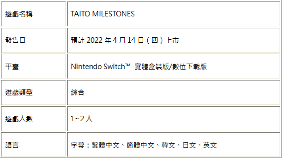亚克系统(ARC SYSTEM WORKS)亚洲分店宣布,TAITO CORPORTION的Nintendo Switch™综合游戏《太东里程碑》官方中文实体盒装版及数位下载版确定于 2022 年 4 月 14 日(四)上市,并且实体盒装版预售现正进行中。