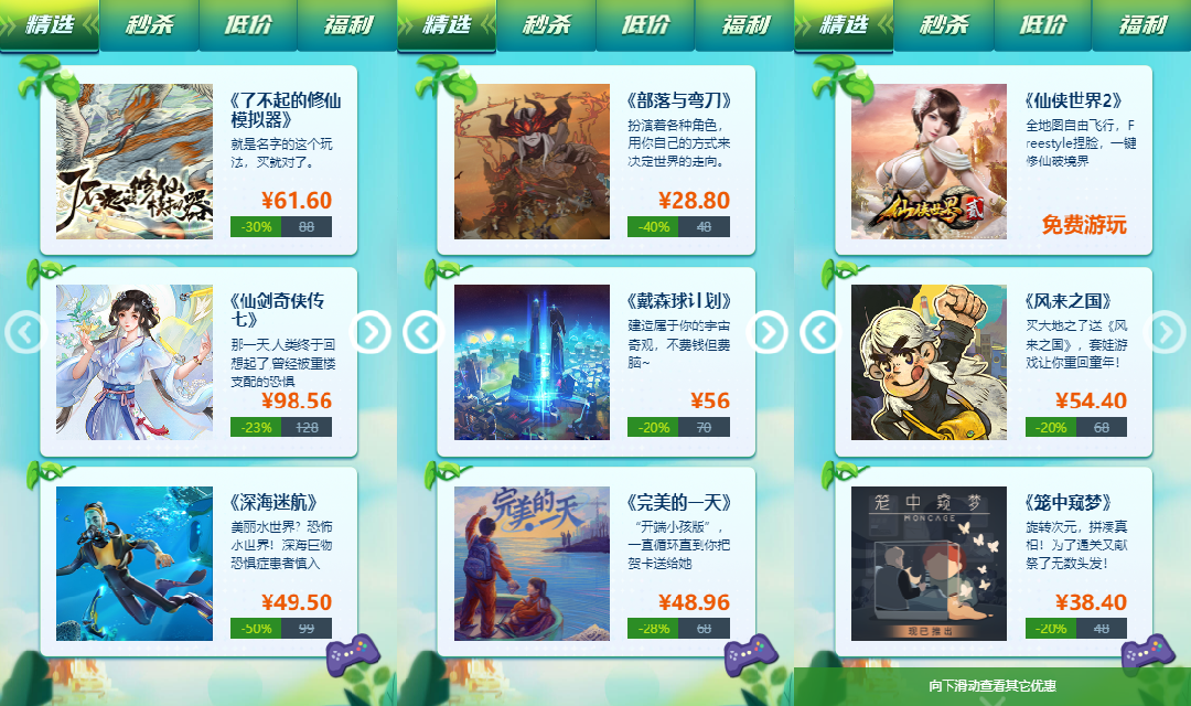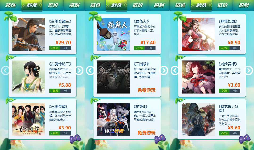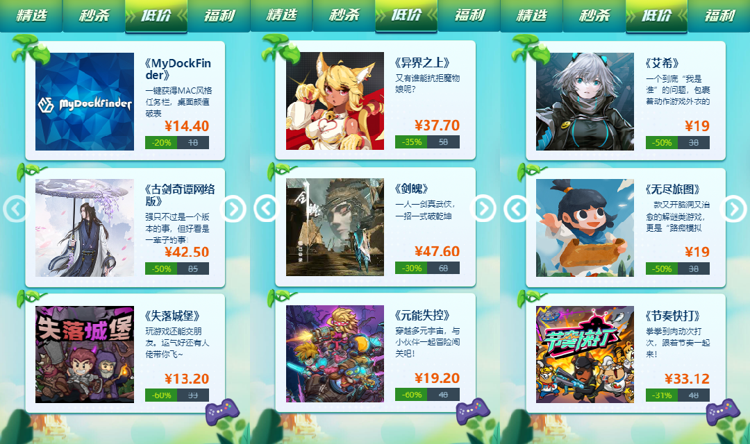 【秒杀】游戏夏促期间均为超低价!如《古剑奇谭》三部系列游戏、《面条人》、《神舞幻想》、《同步音律》、《隐龙传》、《六月衷曲》、《洪潮之焰》等多款高分游戏,均为限时低价!在这个标签页看到的游戏入手绝对划算,错过血亏!