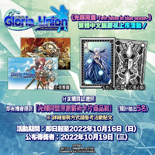 亚克系统亚洲分店为庆祝《光辉同盟 -Twin fates in blue ocean-》繁体中文版上市,从今天起举办抽奖活动。将《光辉同盟 -Twin fates in blue ocean-》繁体中文版或《圣剑同盟 + 光辉同盟 remastered collection》繁体中文版购买认证照上传到自己的Facebook上并参加抽奖活动,即有机会得到“光辉同盟原创战术卡片商品组”!(预计抽出5名)