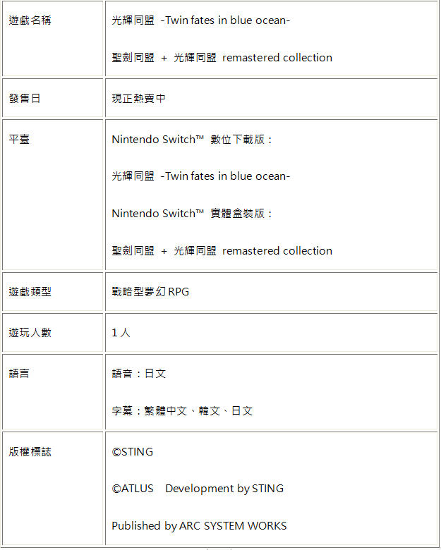 亚克系统(ARC SYSTEM WORKS)亚洲分店宣布 STING公司的战略型梦幻 RPG — Nintendo Switch™ 《光辉同盟 -Twin fates in blue ocean-》繁体中文版与《圣剑同盟》繁体中文版的实体盒装版合辑—《圣剑同盟 + 光辉同盟 remastered collection》今天正式上市,并举办庆祝上市活动。