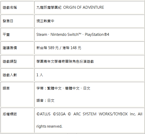 为庆祝今天《九龙妖魔学园纪 ORIGIN OF ADVENTURE》中文版正式于Steam平台上市,本作的PlayStation®4与Nintendo Switch™ 版也正式调降售价,玩家可以用更实惠的价格游玩到本作。