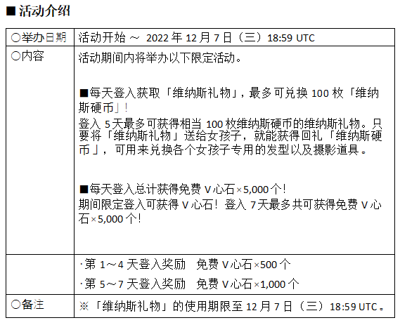 同时,也现正举办能获得“免费 V 心石×最多 5,000 个”、礼物道具“纳斯礼物”等奖励的期间限定登入奖励。