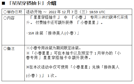 “小春”能在今天推出的“星星穿搭抽卡”中,获得新 SSR 泳装“接待美人(小春)”后招待至岛上。付费 V 心石抽卡可额外获得“小春星星”。集满 200个“小春星星”即可兑换 1 套小春专用 SSR 泳装。