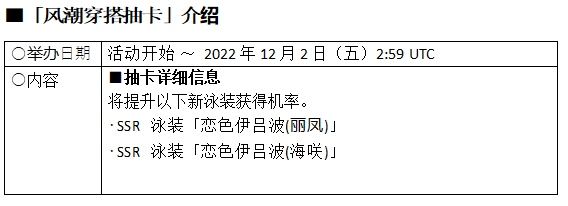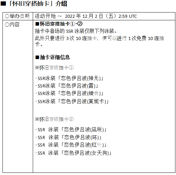 此外,“丽凤”“海咲”的新 SSR 泳装“恋色伊吕波”登场的“风潮穿搭抽卡”,以及“霞”和“环”等 8 位女孩的 SSR 泳装“恋色伊吕波”登场的“怀旧穿搭抽卡”也开始了。活动期间内,2 种“怀旧穿搭抽卡”每天都可以进行1 次免费抽卡。