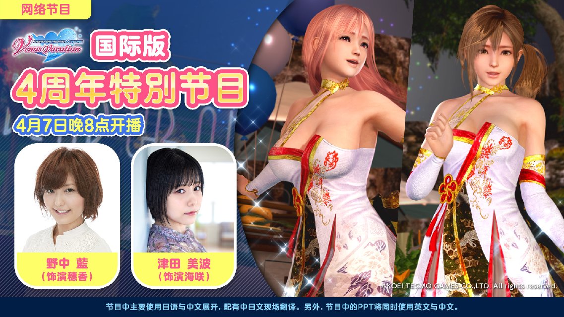 此外,为纪念营运开始4周年,预定于4月7日晚上8点(CST)于YouTube/Steam产品页面播出网络节目「DEAD OR ALIVE Xtreme Venus Vacation 国际版4周年特别节目」。当天节目将邀请饰演穗香的「野中蓝」和饰演海咲的「津田美波」两位来宾。和豪华的来宾们一同欢度4周年吧。