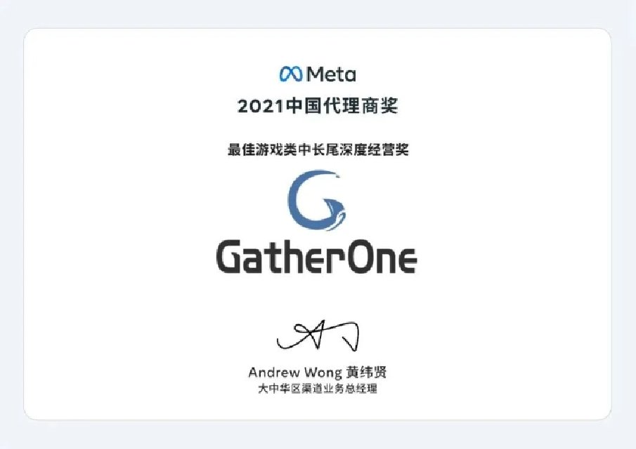 2019 年 1 月起 GatherOne 正式成为 Meta 官方代理商,同时加入 Google 优秀合作伙伴 ( Google Premier Partner ) ,目前可提供 Meta、Google、TikTok、Kwai、Twitter、Apple search 的官方代理服务。GatherOne 总部位于北京,分部设于杭州、 长沙,业务遍布北京、上海、广州、深圳、长沙、重庆、成都、武汉、合肥等 30 多个城市。