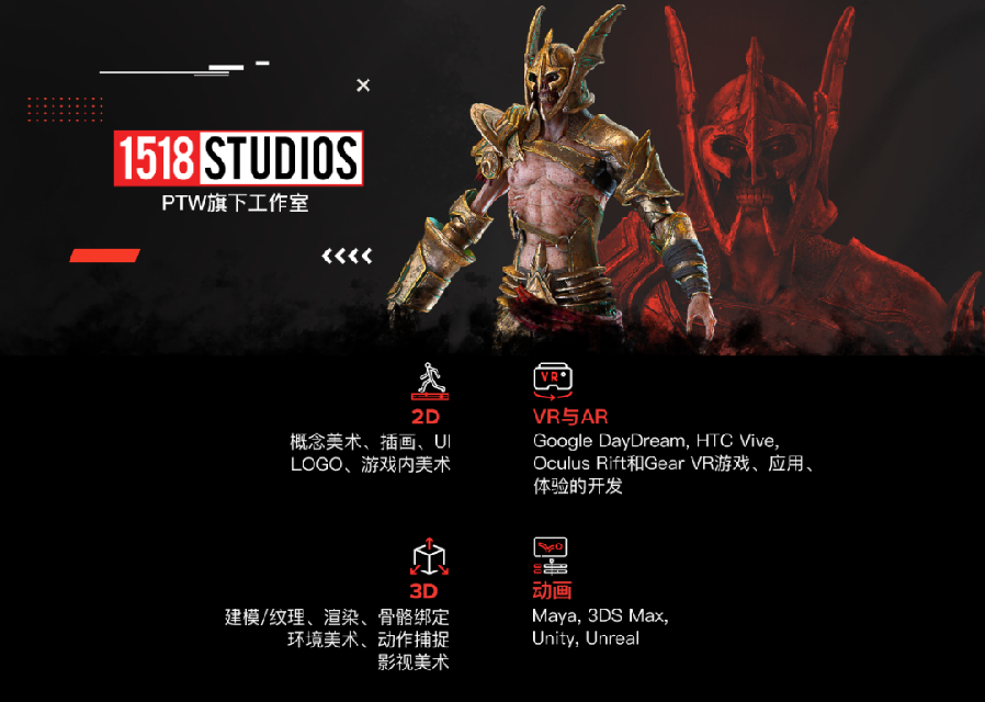 游戏美术千变万化,1518 工作室致力于与行业伙伴们密切合作,应对游戏行业的潮起潮落。2021 年初,PTW 收购了世界一流的美术团队 5518 Studios,并与前游戏研发工作室 Orange Rock 重组为 1518 Studios。1518 为合作伙伴提供一站式的游戏研发服务,包括游戏美术和游戏开发等服务。