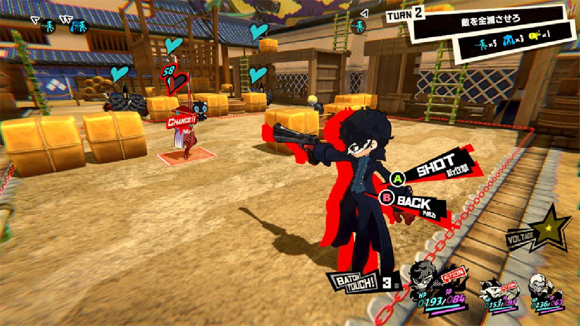 敌人被击飞到 JOKER 的射击范围内,防御状态也被解除,进入“CHANCE!!”(可发动“1MORE”的状态)!