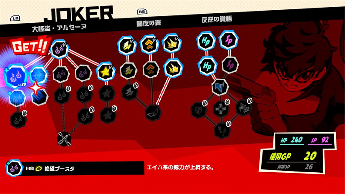在技能树中能自由培养可编入队伍的所有角色。战斗胜利提升怪盗团Lv,或在“TALK”中观看角色间的对话可获得培养角色所需的GP(成长点数)。