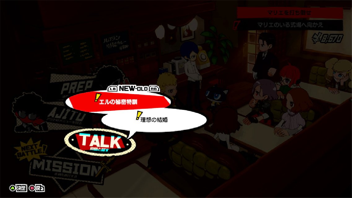 在秘密基地的“TALK”中可以观看同伴间的对话。在这里不仅可以聆听有助于加深剧情理解的对话,还可欣赏到至今从未见过的角色组合间的闲聊,一睹怪盗团成员和埃尔等角色不为人知的一面,进一步享受本作剧情和角色之间的点滴互动。