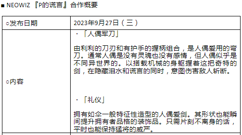 另外,在与DLC同时发布的免费更新中,还可以获得NEOWIZ 『P的谎言』的合作武器「人偶的军刀」和「礼仪」。