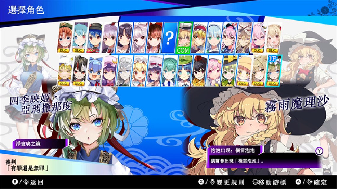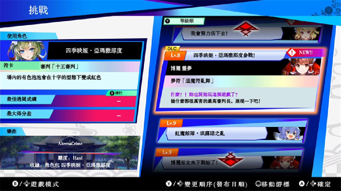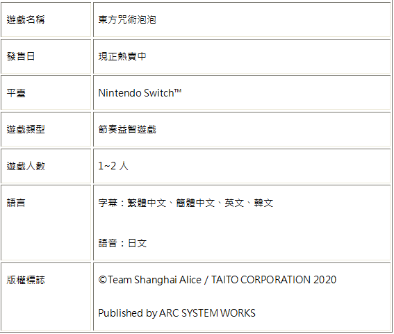亚克系统(ARC SYSTEM WORKS)亚洲分店宣布,TAITO公司的节奏益智游戏《东方咒术泡泡》Nintendo Switch™中文版包含了第九波新角色“四季映姬·亚玛撒那度”与新乐曲的DLC“角色包 四季映姬·亚玛撒那度”上市。