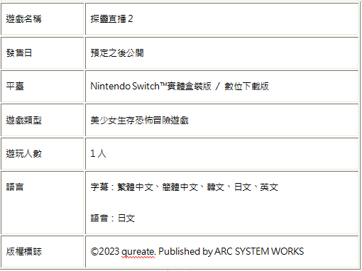 亚克系统(ARC SYSTEM WORKS)亚洲分店宣布,曾于2021年冬天推出相当具话题性的 qureate 公司的美少女生存恐怖冒险游戏《探灵直播》的官方续作《探灵直播2》确定推出中文实体盒装/数位下载版,并公开了游戏相关资讯和中文游戏画面。