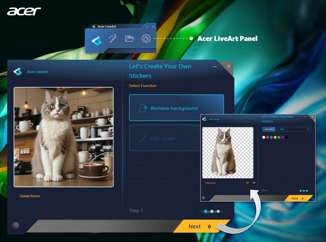 Acer Live Art是大家比较熟悉的AIGC类应用。它可以帮助用户即时删除带有人物、动物和物体的图像背景,并创建贴纸一样的自由编辑和拼贴,当用户使用Windows照片查看器截图或打开图像时, Live Art面板将自动触发以提供帮助,这意味着简单抠图、简单修图等任务几乎不再需要使用Photoshop这类传统工具了。