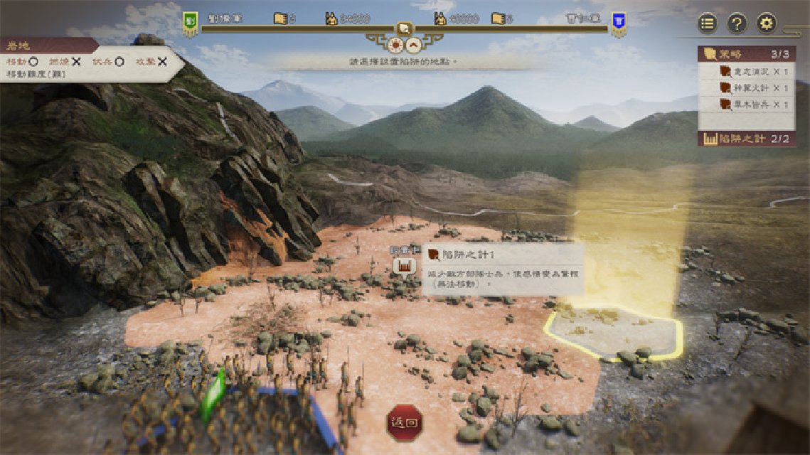 在战斗开始前,玩家可以透过“军议”决定战斗开始时部队的配置、“策略”等整体方针。“策略”是总帅可以在战斗中执行的指令,具有能左右战况的强力效果,因此要审慎评估该准备哪种“策略”以及发动时机。此外,防守方可以在“军议”中设置“陷阱”,中了“陷阱”的部队行动会受到限制,如果能有效活用“陷阱”,就可以使战况变得对我方有利。