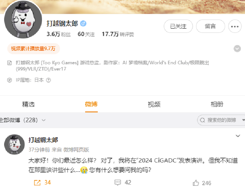 2024 CiGADC首位分享嘉宾确认!打越钢太郎分享话题征集中!