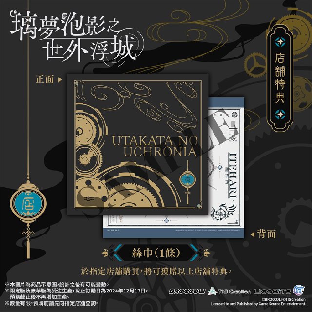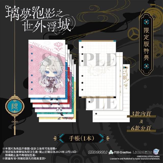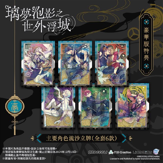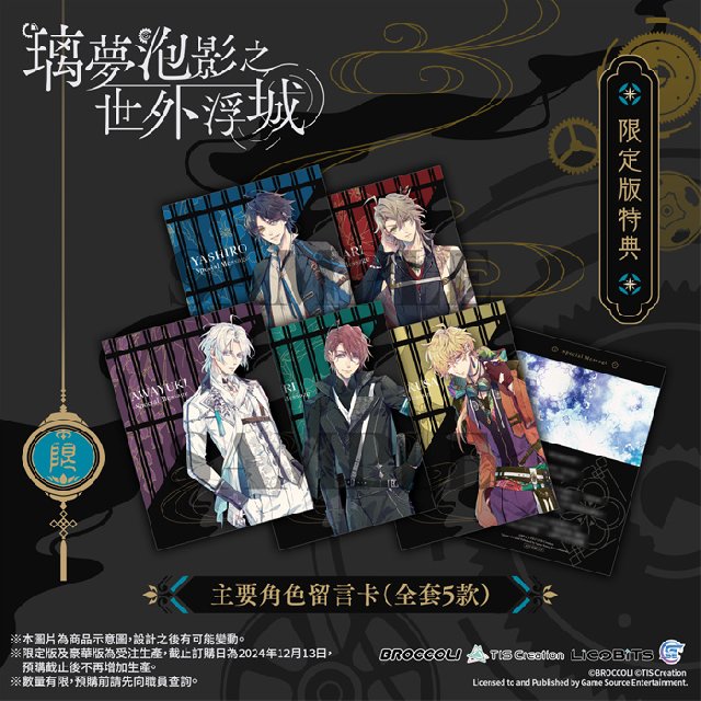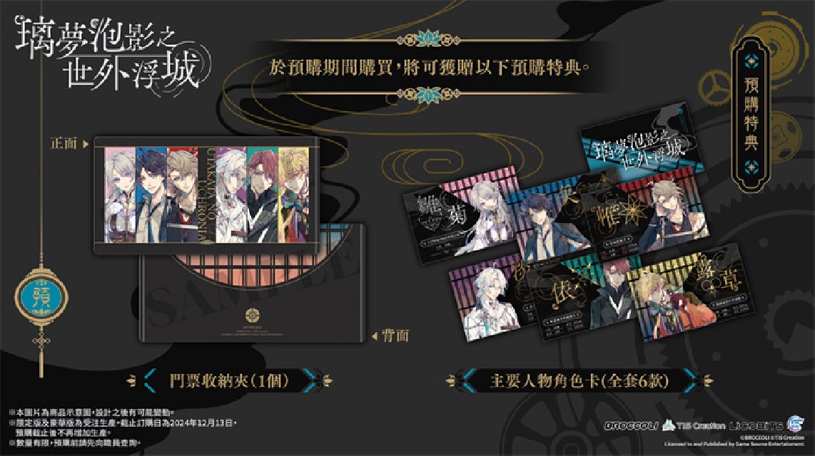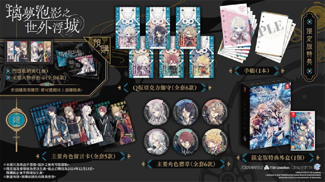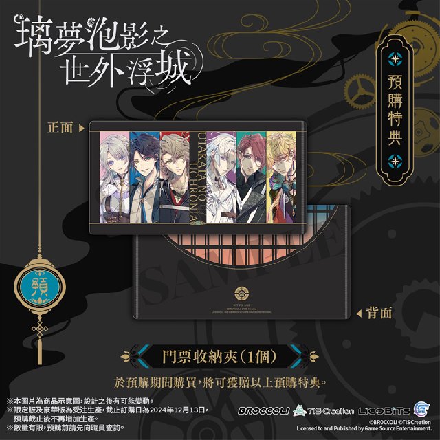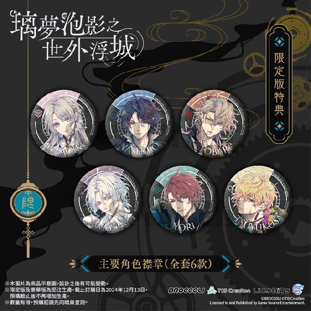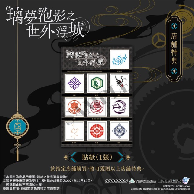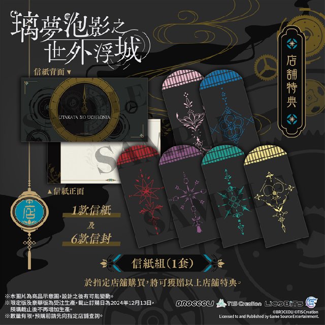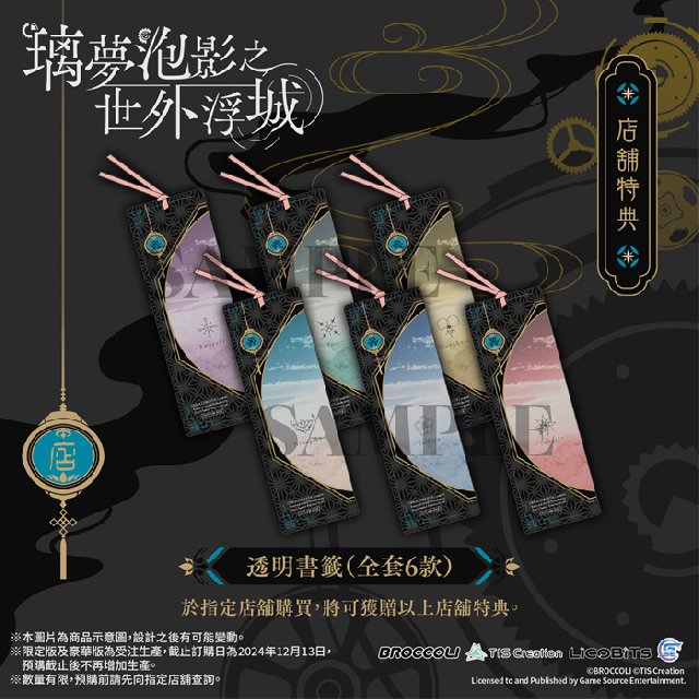 GSE Otome联同香港、澳门及台湾部分店家推出通路预购特典,凡于以下指定店家预购Nintendo Switch™《璃梦泡影之世外浮城》亚洲繁体中文版,即可额外获赠指定款式的独家特典。