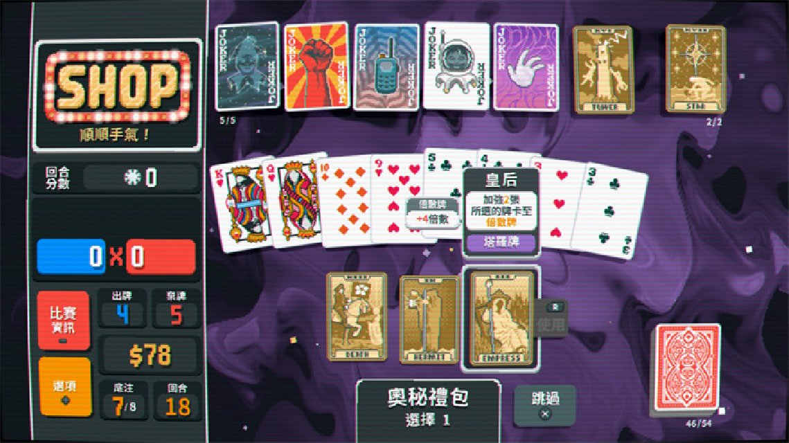 巧妙部署各式牌组、小丑牌、塔罗牌、行星牌、幻灵牌,以及礼券等等多不胜数。利用这些功能牌触发威力强大的COMBO,增强你的出牌实力,享受令人肾上腺素飙升的牌局吧!