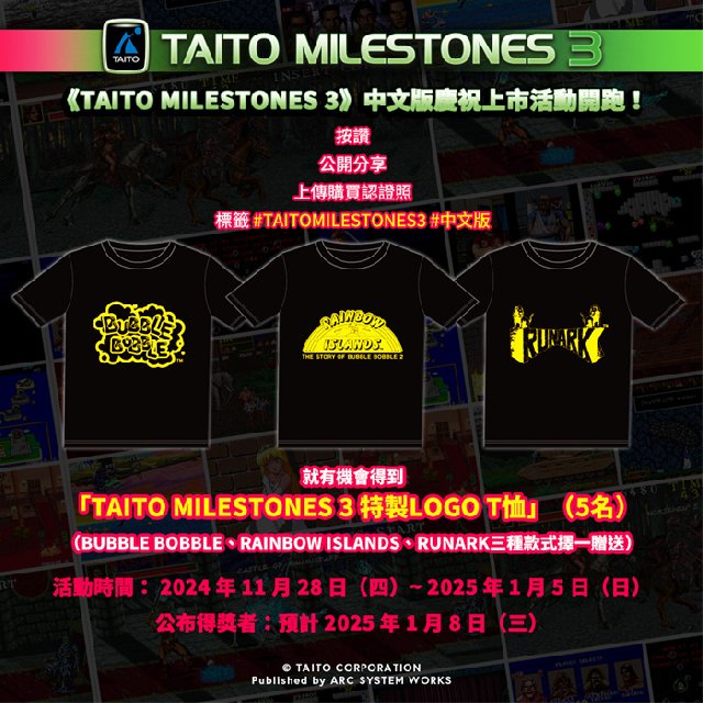 为庆祝《TAITO MILESTONE 3》中文版上市,从今天起举办抽奖活动。公开上传购买认证照或是游玩游戏的画面并留下关于本作的感想,就有机会得到由BUBBLE BOBBLE、RAINBOW ISLANDS、RUNARK三种游戏主题设计而成的“TAITO MILESTONE 3 特制LOGO T恤”其中一款。