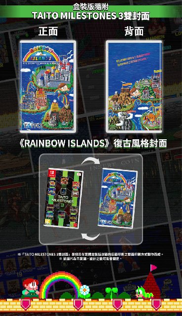《TAITO MILESTONES 3》中文实体盒装版随附的双封面其中一种是以本作收录的游戏《RAINBOW ISLANDS》为主题特别设计的封面,购买者可使用自己喜欢的设计来更换《TAITO MILESTONES 3》的封面。