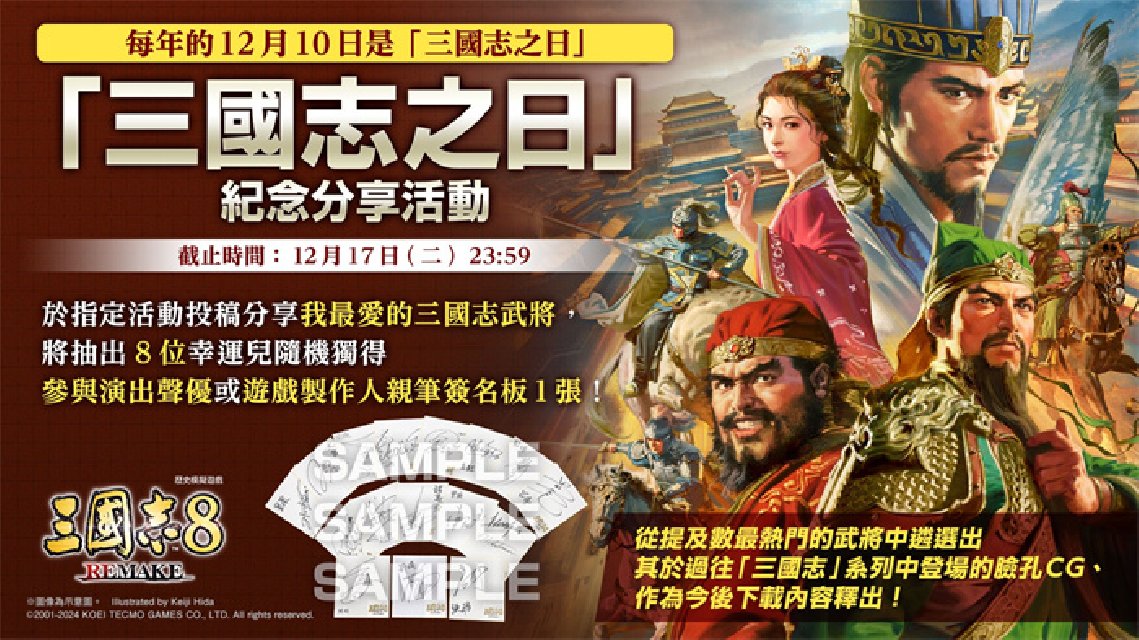为欢庆一年一度的“三国志之日”,将于“台湾光荣特库摩”粉丝专页的指定投稿同步展开“我最爱的三国时代武将”募集活动!只要于指定活动投稿留言处写下你最爱的三国志武将名,说不定就有机会独得一张于‘三国志8 REMAKE’中演出的“武将声优亲笔签名板”或“制作人亲笔签名板”。本活动将以随机方式、抽选送出八位幸运玩家,期待所有三国志迷的参与、分享。