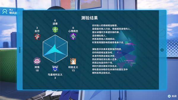 在游戏开始前,系统会让玩家做一份心理问卷调查,来决定玩家的三元属性,这主要体现在对话中的一些特殊选项上和隐藏的被动技能,同时在每一章结束后玩家都会获得一份问卷调查,我个人建议没必要为了属性而答题,顺其自然就好。