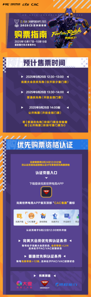本次CAC门票分为【完美大会员优先购】、【普通优先购】和【公开购票】三轮开售,给予真正的CS玩家购票特权,不给“黄牛”可乘之机。