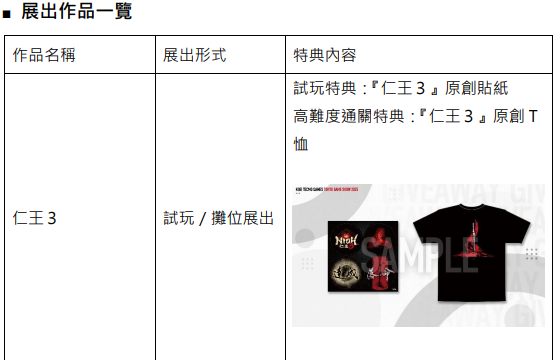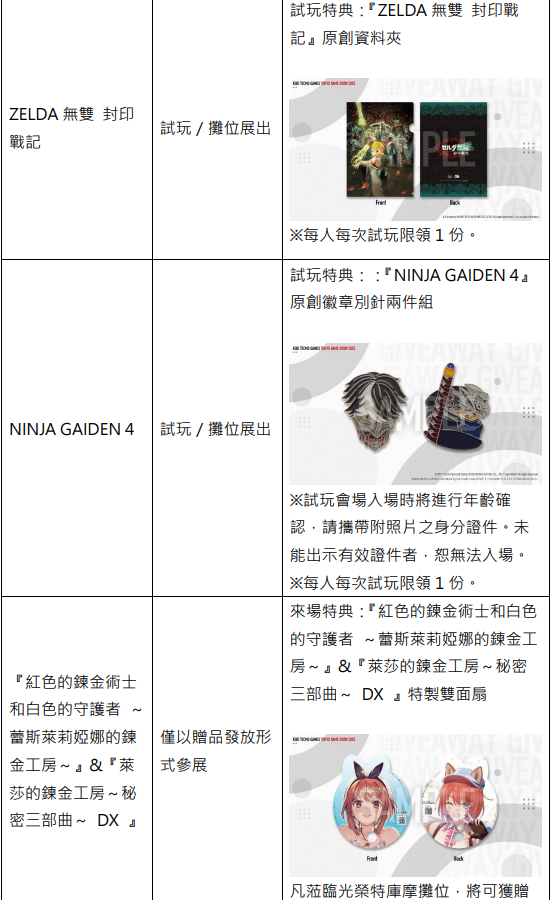 另外在『NINJA GAIDEN 4』的摊位中,将设置亚洲首次登场的试玩台,玩家可于Xbox Series X与PlayStation®5上体验紧张刺激的高速动作玩法。凡参加试玩的玩家,将可获赠『NINJA GAIDEN 4』原创徽章别针两件组,诚挚邀请各位前来体验!