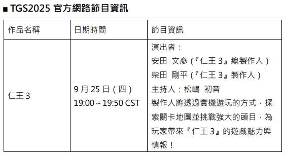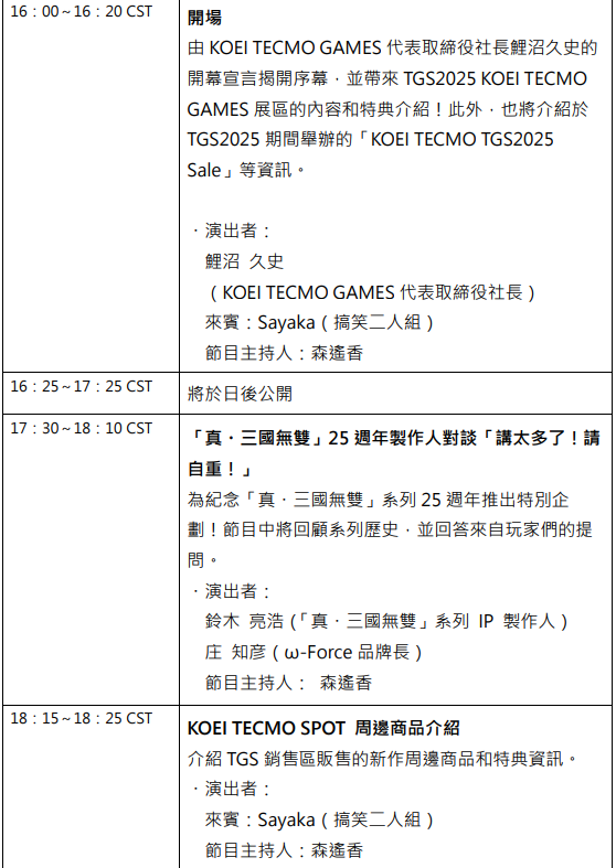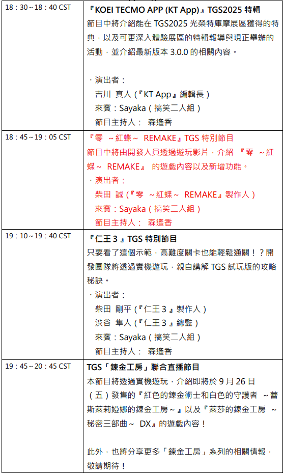 ■「KOEI TECMO LIVE! in TGS2025」節目資訊