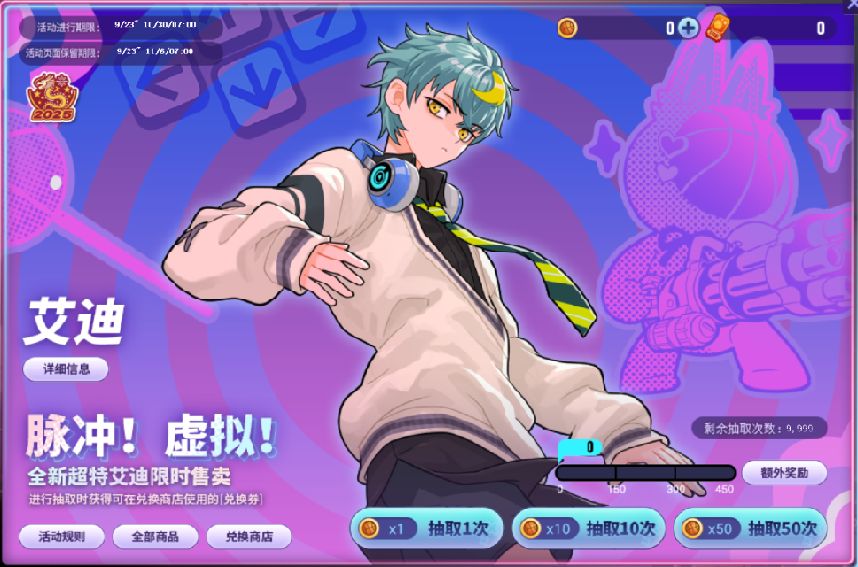 活动时间:9月23日-10月30日07:00活动规则:1. 可以使用限定超特抽取券(艾迪)参与抽取角色的活动。[抽取 1 次] 的概率与 [10 连抽 / 50 连抽] 的概率不同。2. 每次抽取时获得可以获得限定超特兑换券(艾迪)。
