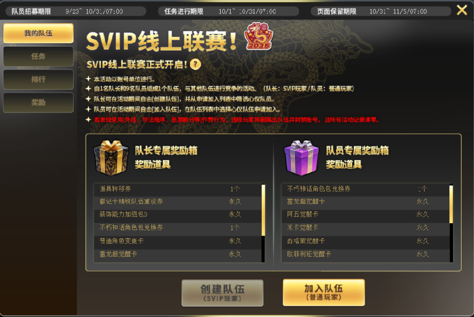 ★本活动以账号单位进行。★由 1 名队长和 9 名队员组成 1 个队伍,与其他队伍进行竞争的活动。(队长:SVIP 玩家 / 队员:普通玩家)★队长可在活动期间自由 [创建队伍],并从申请加入列表中筛选心仪队员。★队员可在活动期间自由 [加入队伍],在队伍列表中选择心仪队伍申请加入。★若发现使用 [外挂、非法程序、恶意刷分等] 作弊行为,违规玩家将被踢出队伍并封禁账号,且所有活动记录清零。本次线上赛的奖励十分丰富,玩家们可以从队长专属奖励箱积极队员专属奖励箱开出心仪的道具。