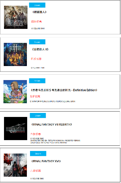 不仅《歧路旅人II》的折扣低至四折,还有《FINAL FANTASY VII REBIRTH》以及《FINAL FANTASY XVI》为首的作品参与活动,能更划算地享受游戏。