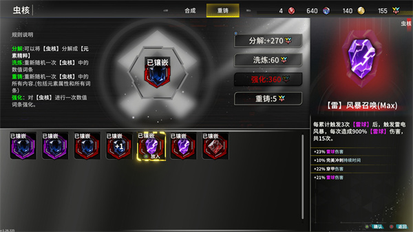 如果不符合需求,可以进行重铸,会改变虫核的属性和词条;但如果获得的是需要的相同属性的虫核,但词条不是特别好,可以用洗练功能刷取有用的词条。
