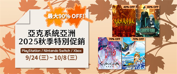 亚克系统亚洲 (ARC SYSTEM WORKS ASIA) 宣布在PlayStation™Store、香港My Nintendo Store及Microsoft Store中进行秋季特别促销活动,并公开在PlayStation®4、PlayStation®5、Nintendo Switch™、Xbox One、Xbox Series X|S平台中包含《Library Of Ruina》等多款游戏的促销情报。