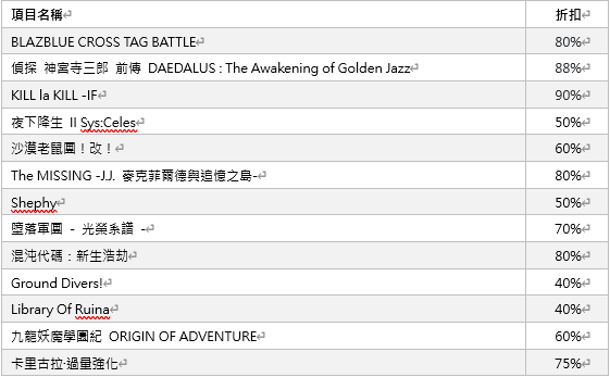 本次促销活动将在各数位商店(PlayStation™Store、香港My Nintendo Store、Microsoft Store)进行,本次除了有70%折扣的《钓鱼明星 世界巡迴赛》之外,还有《Library Of Ruina》、《CRYMACHINA 恸哭奇机》及《九龙妖魔学园纪 ORIGIN OF ADVENTURE》等人气游戏也包含在内。详细促销期间及亚克系统亚洲的促销游戏项目价格资讯如下。