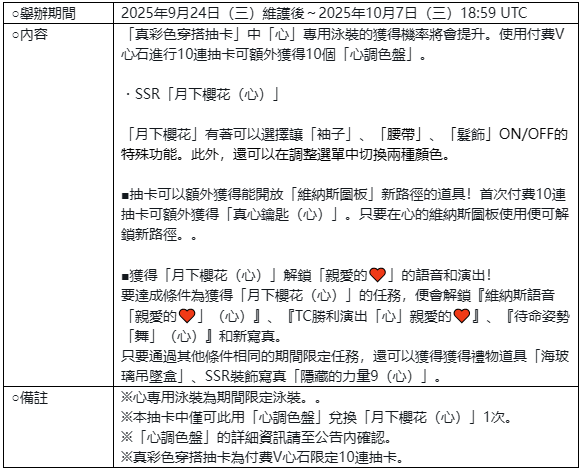 即日起举办「心(CV:川澄绫子)」的新SSR泳装「月下樱花」登场的「真彩色穿搭抽卡(心)」。「月下樱花」有著可以选择让「袖子」、「腰带」、「髮饰」ON/OFF的特殊功能。此外,还可以在调整选单中切换两种颜色。